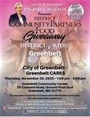 This month’s Free Produce Distribution is our annual holiday food box. Brought to you by Greenbelt CARES in partnership with Prince George’s County Council Member Ingrid Watson. No reservation required. Food boxes will be distributed on a first come, first served basis and while supplies last. For more information, contact Bria Archie at BAArchie@co.pg.md.us or (301) 952-3094.