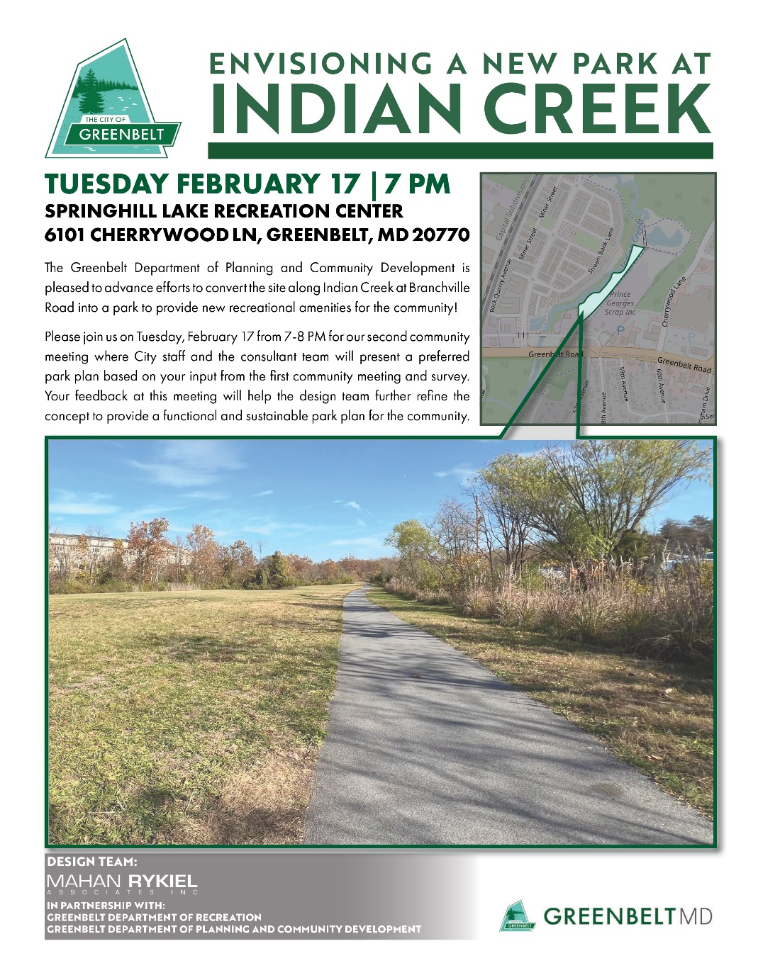 The City of Greenbelt is planning a new park along Indian Creek at Branchville Road, located adjacent to Greenbelt Station. As this park will directly serve nearby residents and likely be used most by the community, your participation and feedback are especially important.